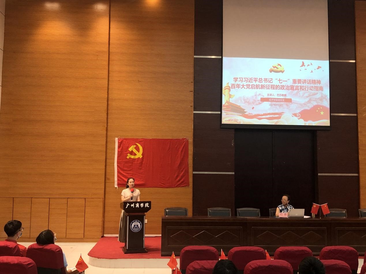 为进一步学习贯彻落实习近平总书记“七一”重要讲话精神的核心要义和深刻内涵,经济学院党总支于2021年9月16日下午在图书馆报告厅开展学习习近平总书记“七一”重要讲话精神专题学习会,本次《百年大党启航新征程的政治宣言和行动指南》的专题学习会特邀马克思主义学院巴莎院长授课。出席本次学习会的有经济学院院长陈石清、副院长张绍合、党总支书记张雪梅、经济学院全体教职工、学生党员和学生骨干。本次会议由张雪梅书记主持。