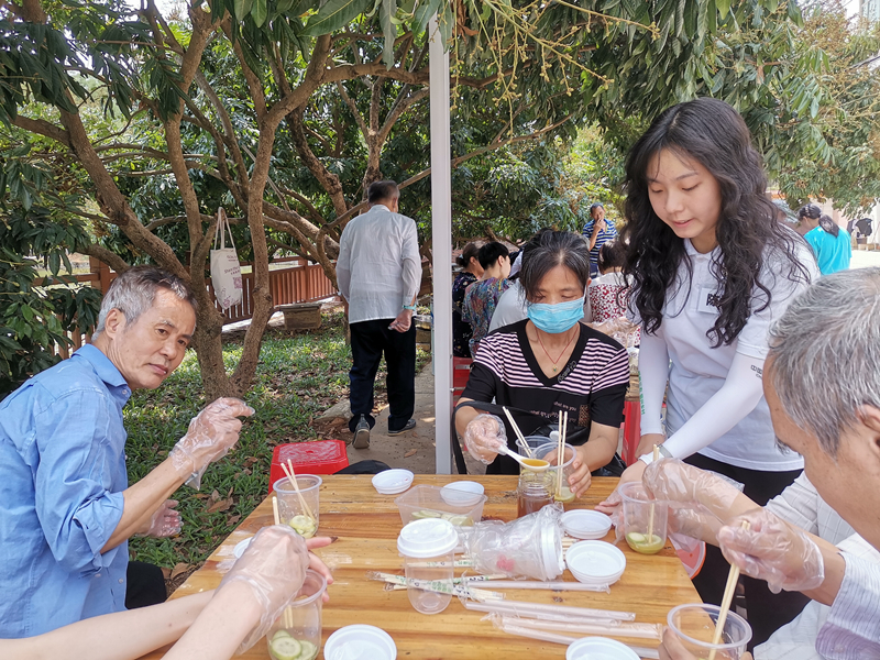 在迳下村助农综合服务中心陈玲社工的带领下,三位学生志愿者在各自的站点上引导游客完成观赏打卡并帮忙拍照,让他们了解迳下村悠久的历史,并协助维持好现场秩序。为品尝传统美食,体验不一样的风土人情,学生志愿者带领游客到星光老年人之家体验特色美食银针粉的制作。下午时分,学生志愿者带领游客们进入山里体验乡村采蜜,并制作柠檬蜂蜜水。最后,学生志愿者带领游客们在种植经验老户的亲自指导下完成了盆栽的种植。志愿者们用实际行动诠释志愿服务精神,在志愿服务中奉献自己,得到了游客们的一致好评。