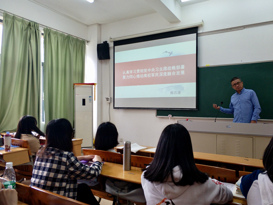 为了深入贯彻落实习近平主席提出的实施军民融合发展战略要求、让两会精神走入校园,我院于2018年3月28日在四教204开展了第一堂思想政治理论课系列之“认真学习贯彻党中央习近平主席战略部署,聚力同心推动高校军民深度融合的发展”课堂,主讲人为金融学院院长陈石清教授,授课对象为金融学院17级学生。