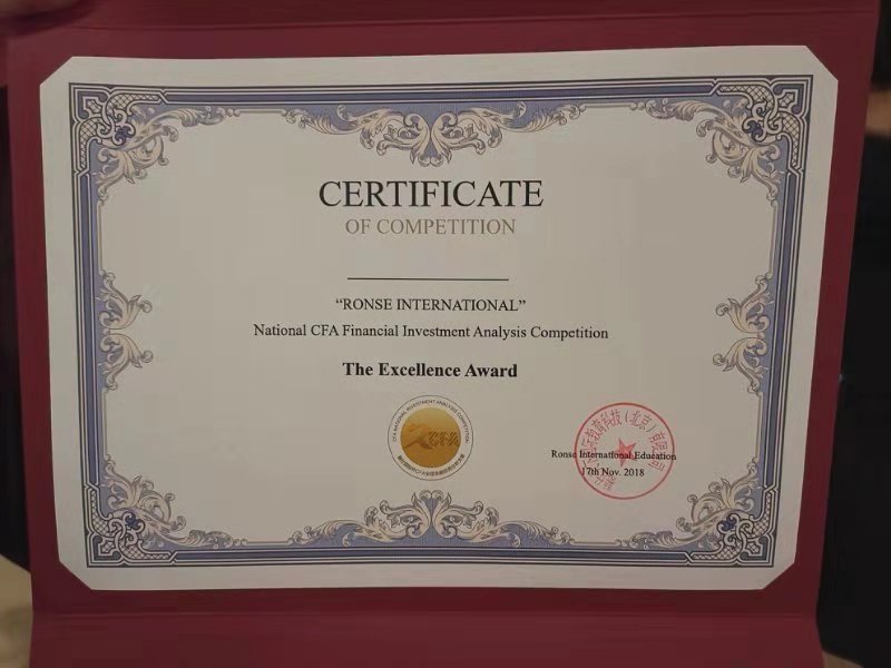 CFA精英班学生参加“第一届融仕国际杯全国CFA金融投资分析大赛”获奖证书