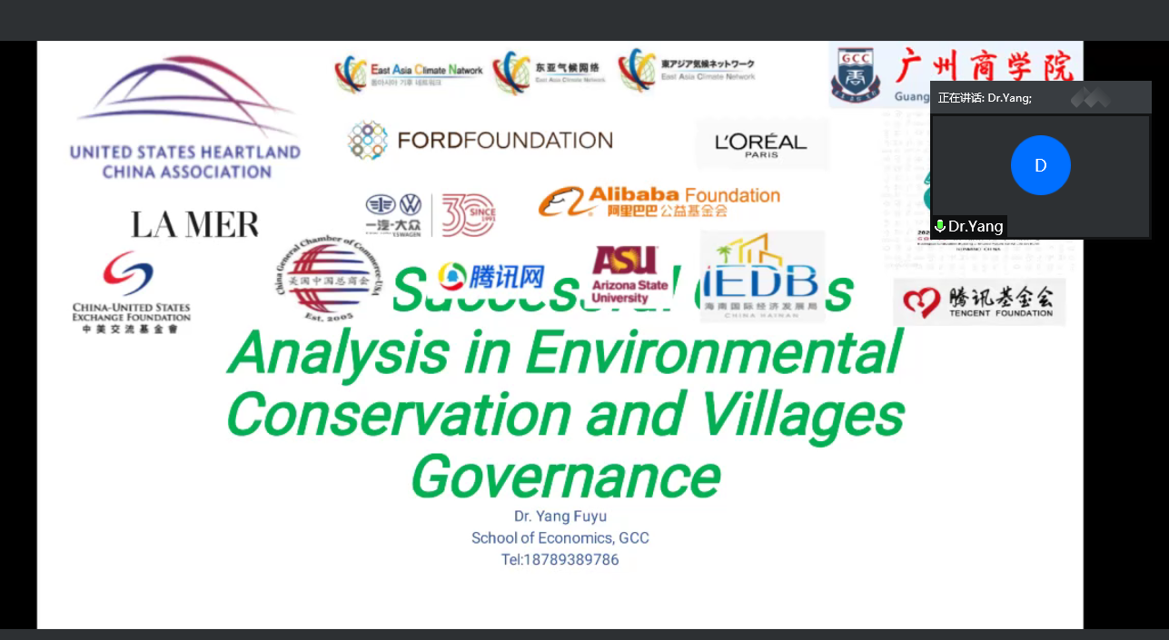 杨馥毓博士分享的主题为环保与乡村治理视角下的成功案例分析及介绍。内容主要分为四个部分:理论与背景介绍、海南可持续经济分析、海南乡村治理成功案例分析及可比较视域下的广东乡村治理案例。主要介绍博鳌沙美村等以会展和旅游相互结合路径的乡村治理案例、美联村的环境治理与民宿旅游相互结合的案例、以及老君山黎明社区和广西壮族自治区三甲屯南院“无为而治”的治理逻辑,最后引申出广东省未来在乡村治理、海洋经济等领域继续深入研究的可行性和广阔空间。