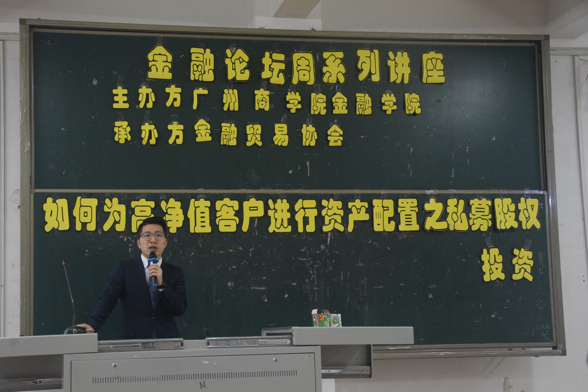 为了让大学生们认识到当前金融市场形势,加强对金融市场的了解,增强大学生的技术分析能力,更好地做到学以致用,为将来从事金融行业工作打好基础。金融学院于2018年12月11日下午在第一教学楼111课室举办了以“如何为高净值客户进行资产配置之私募股权投资”为主题的金融学院第二届论坛周系列讲座,出席本次讲座的领导和嘉宾分别有金融学院院长陈石清教授、北京恒昌汇财投资管理有限公司佛山南海财富中心刘岳强总经理、坤元资产投资管理有限公司区域投资总监张跃振先生、坤元资产投资管理有限公司经理翟研芳女士、金融学院教师姚军老师、杨娜娜老师。