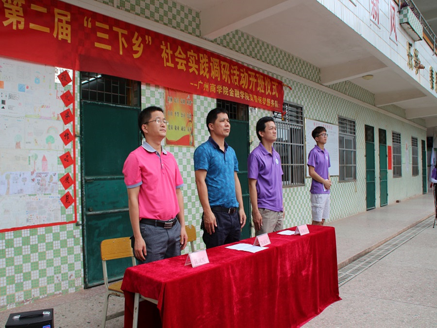 阳光高照,天清气朗。广州商学院金融学院青春逐梦服务队暑期社会实践调研活动开班仪式于7月11日9:00在杨子坑小学隆重举行。杨子坑村委副主任陈观添、杨子坑小学校长陈斌兴、指导老师陈敬宗、青春逐梦志愿服务队全体成员及杨子坑小学49名学生出席了此次开班仪式。