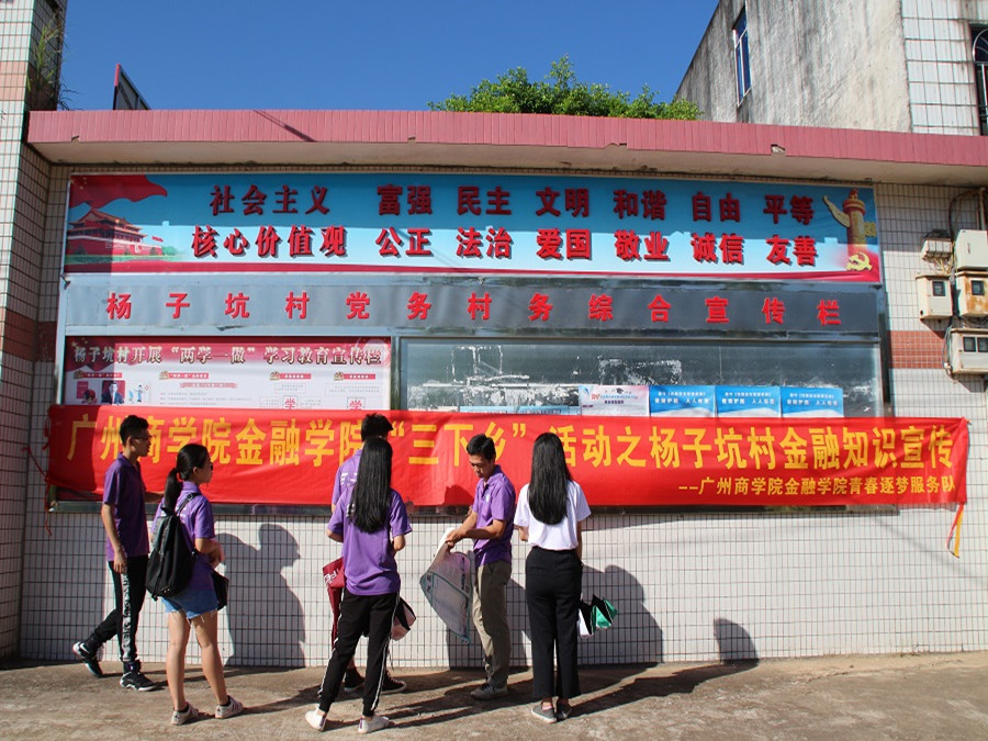 为了在杨子坑村宣传基本的金融知识,提高当地居民的金融能力,广州商学院金融学院青春逐梦服务队于7月14日在杨子坑村公共服务中心进行金融知识宣传。青春逐梦服务队成员在指导老师的陈敬宗的带领下进行此次金融知识宣传活动。