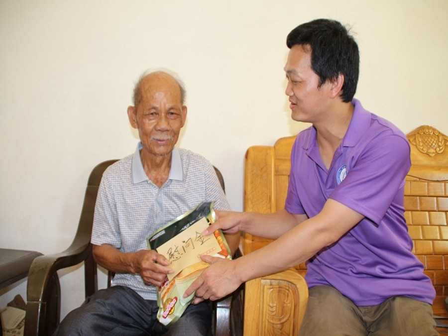接下来,我们去探访了两位年迈的老兵,老兵给同行志愿者们上了一节生动的党课,为我们讲解他们当兵打战的光荣事迹,并给我们展示了他们当年当兵的照片,让我们同行几人获益匪浅。在最后,由陈敬宗老师为他们送上慰问金及慰问物资,并合影留念。