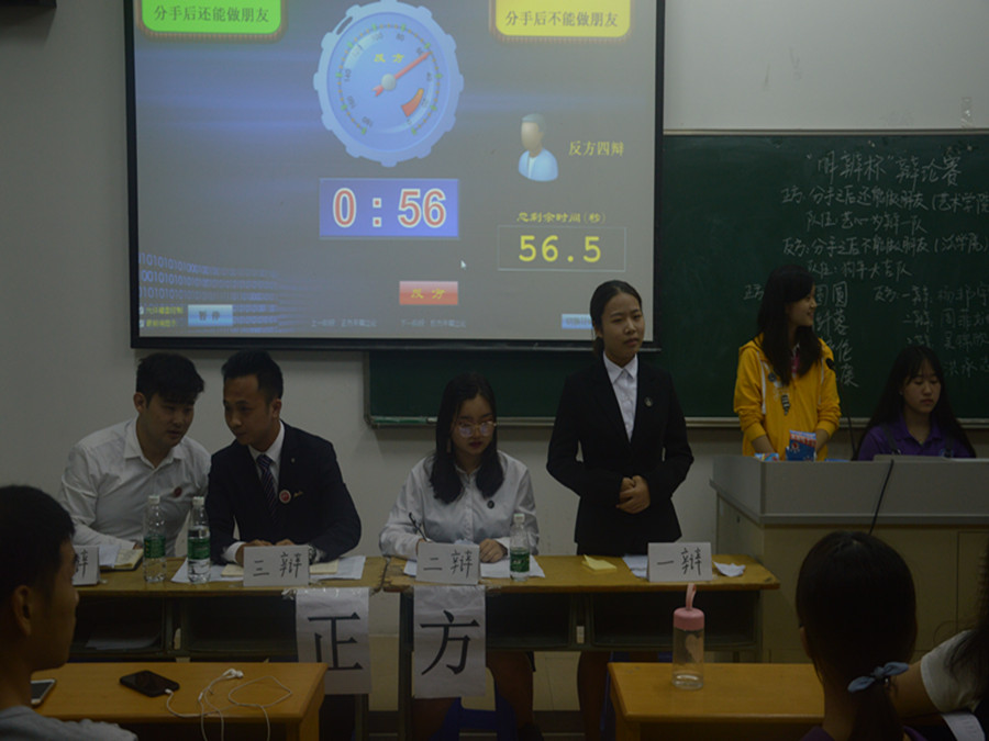 随着主席的开场,“明辨杯”四强赛第一场正式开始。主席介绍参赛队伍:正方来自艺术学院——“艺心为辩一队”——邓圆圆、刘纤蓉、黄堃伦、苏文康,他们的辩题为“分手之后还能做朋友”;反方的辩题为“分手之后不能做朋友”,他们来自法学院——“狗年大吉队”——杨邦宇、周菲娴、吴锦欣、洪承志,双方的辩论精彩极了,双方就这样滔滔不绝地辩论着。谁也说服不了谁,谁也辩不赢谁。精彩的辩论赛场面热烈,耐人寻味,激烈程度历史重演,擦枪走火的场面让人目瞪目呆,辩论让评委感到震撼,观众将精神都集中在双方的激烈辩论中,让人感觉汗毛孔都被打开了,双方言语搏杀互不相让。最后评委对正反双方进行了专业点评,肯定了双方辩手的风度,观点鲜明。最后恭喜反方——法学院取得本场比赛的胜利!