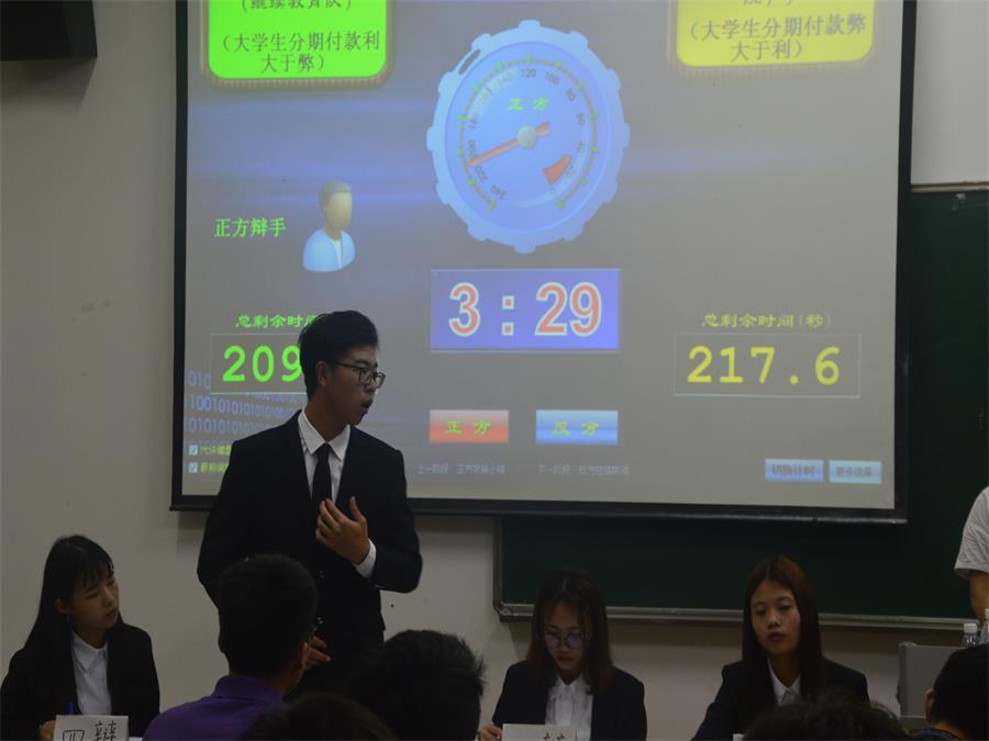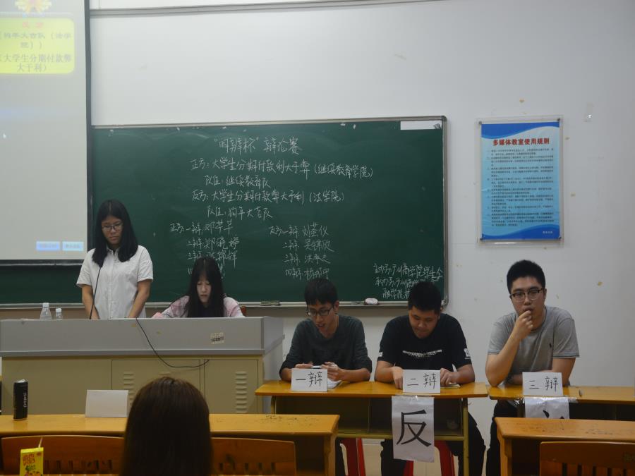 伴随着主席的发言,继续教育学院和法学院正反双方辩手进行了自我介绍,辩论赛正式开始。正方是来自继续教育学院——“继续教育队”——邓芊芊、郑晓婷、陈锦辉、刘慧四名辩手,所持观点为“大学生分期付款利大于弊”;反方是来自法学院——“狗年大吉队”——刘荟仪、吴锦欣、洪承志、杨邦宇四名辩手,所持观点为“大学生分期付款弊大于利”。首先进行正反双方的陈词与质询环节,言辞犀利,双方辩手配合默契,当仁不让。自由辩论环节更是将比赛推向高潮,过程激动人心,精彩纷呈,赢得了全场观众的热烈掌声。最后环节为双方总结陈词,再次强调各自所持观点,语言犀利,条理清晰。每只队伍都气势逼人,力求在气势上压倒对方。双方面对对方辩友的猛烈攻击下镇定自若,凭借快速的反应和有力的言辞化险为夷。最后评委代表对正反双方进行了专业点评,并提出了他们的优缺点,同时就辩题提出了自己的意见和建议。最后主席宣布了比赛结果,恭喜比赛的优胜方:法学院——“狗年大吉队”获胜!