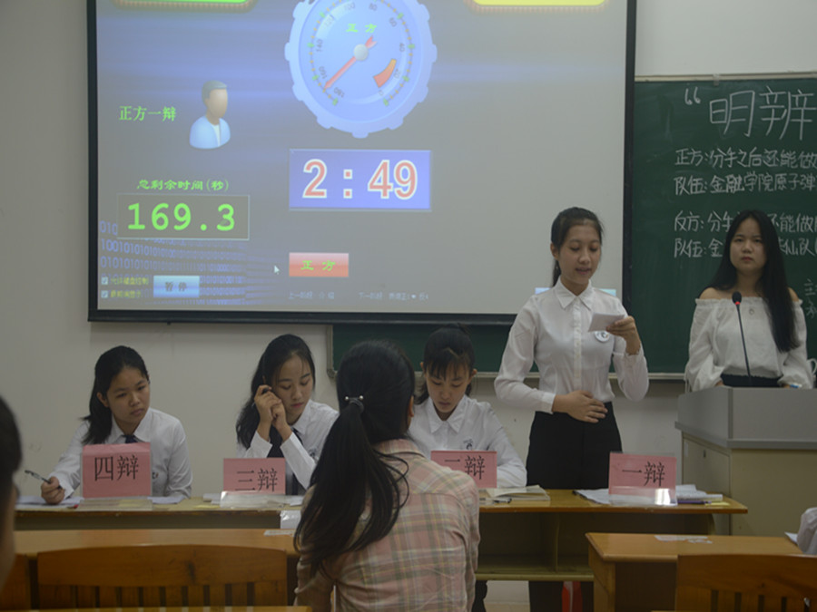 由校学生会、校团委主办,金融学院学生会与辩论协会共同承办的“明辨杯”辩论赛四强赛第二场于2017年5月9日晚在四教304教室顺利举行。辩论协会的黄沁、崔琪、刘荆鸿担任此次比赛的评委。