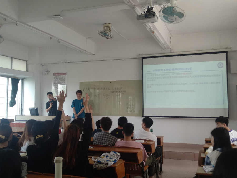 接着,开展了本科教学工作合格评估知识竞答。以宿舍为单位,采用抢答形式,抢答成功并答对积1分,答错扣1分,按积分高低排名。同学们积极回答问题,现场气氛活跃,通过知识竞答环节加深了同学们对本科教学工作合格评估知识的认识。