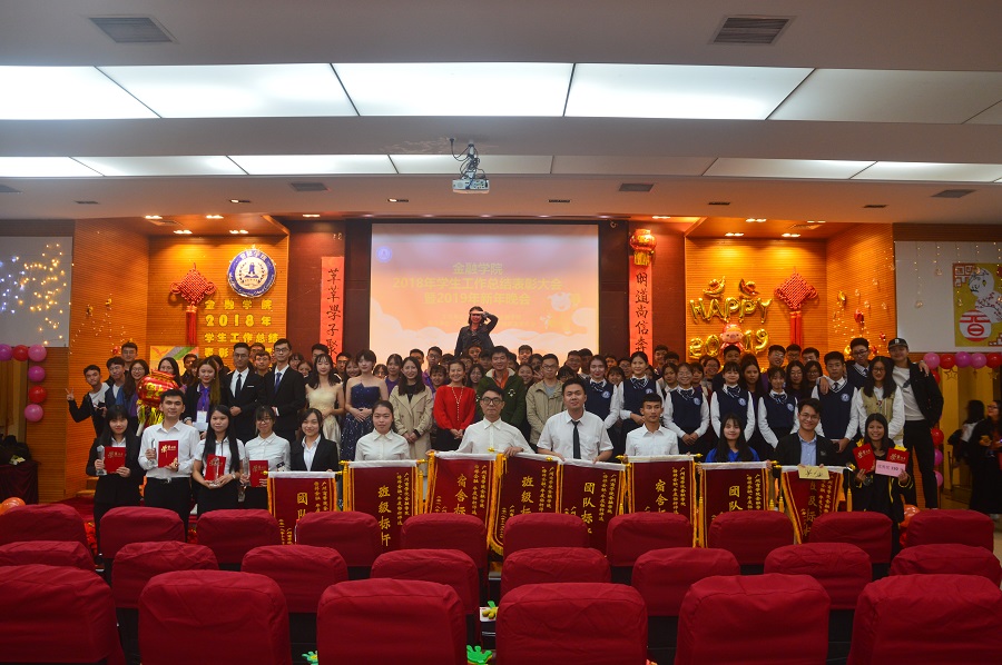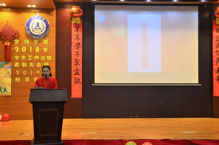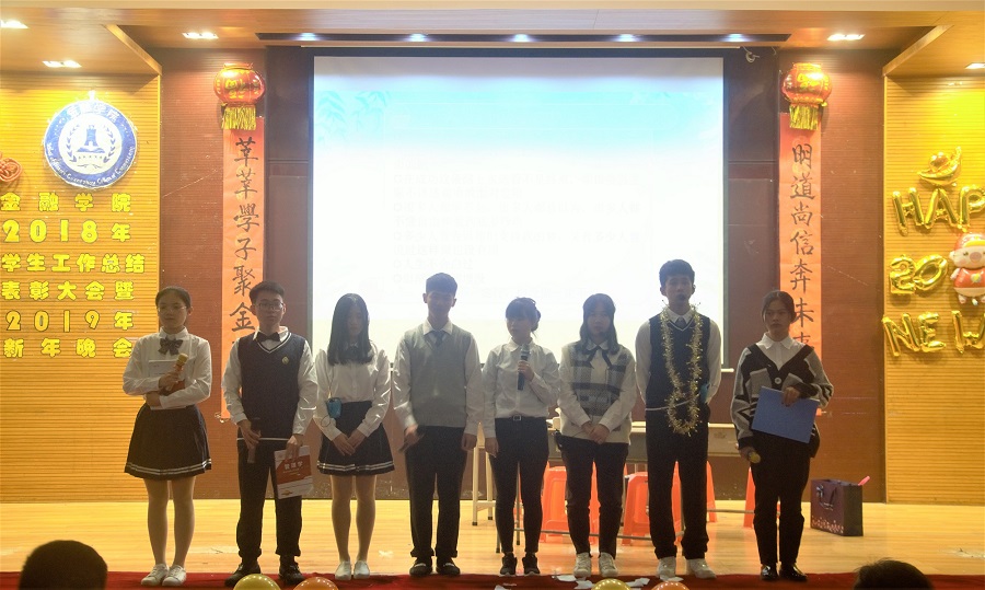活动在主持人热情饱满的开场白中正式拉开帷幕,并通过一段精致的视频回顾了金融学院2018学年学生的学习和工作。随后张雪梅书记就2018年学生工作进行总结,肯定了学院在2018年取得的成绩,与此同时号召同学们传承我校校训“求真、立信、笃行”。紧接着,由张燕副院长宣读表彰决定,公布获奖个人以及团体的名单。伴随着榜样金融获奖代表发言结束,新年晚会正式开始。