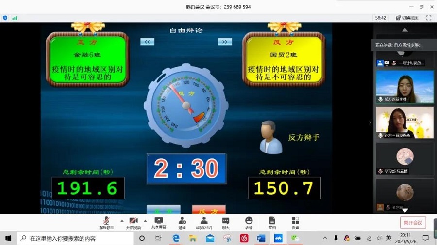本次比赛于5月26日晚上7:30在腾讯会议举行,由经济学院学生会学习部干部姚芝颖主持。本次季军赛到场的嘉宾、评委有经济学院团委书记巫进娣老师、学生会指导老师何锡智、经济学院16级辅导员张素平老师、经济学院19级辅导员刘晶老师、经济学院团委书记处、经济学院学生会主席团、广州商学院校辩论队成员、经济学院红领巾辩论队成员以及各学院辩论队成员。此外,现场的观众多达253人,现场的比赛氛围紧张而热烈。