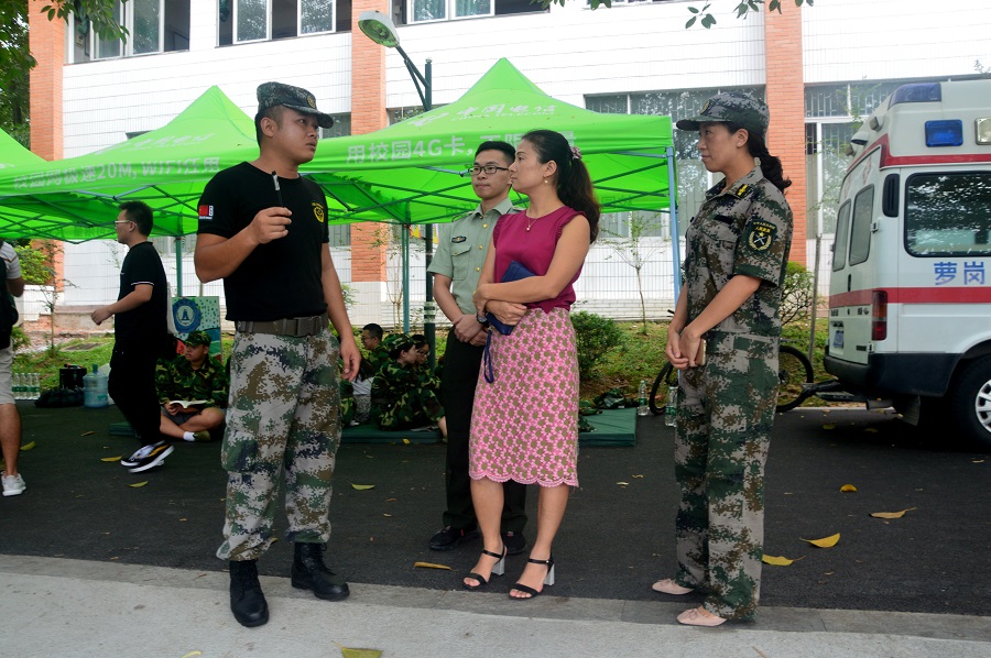 烈日炎炎,张雪梅书记的到来为正在军训的新生送来了一阵阵凉意。首先,张雪梅书记殷切问候了两位退伍复学的金融学子,了解他们在军营的情况,并且希望他们为2018级新生树立好榜样,为新生展示出一名军人的风范。接下来,张雪梅书记慰问了在金融学院大本营医疗点的新生,她十分关心新生的身体状况,同时着重强调了身体是革命的本钱,希望他们注意保重好自己的身体。根据军训的日程安排,张雪梅书记得知金融学院18级新生被安排分开练习,她十分关心新生的情况,与营长亲自交流,深入了解金融学子的情况,同时亲自到连队中去视察工作。