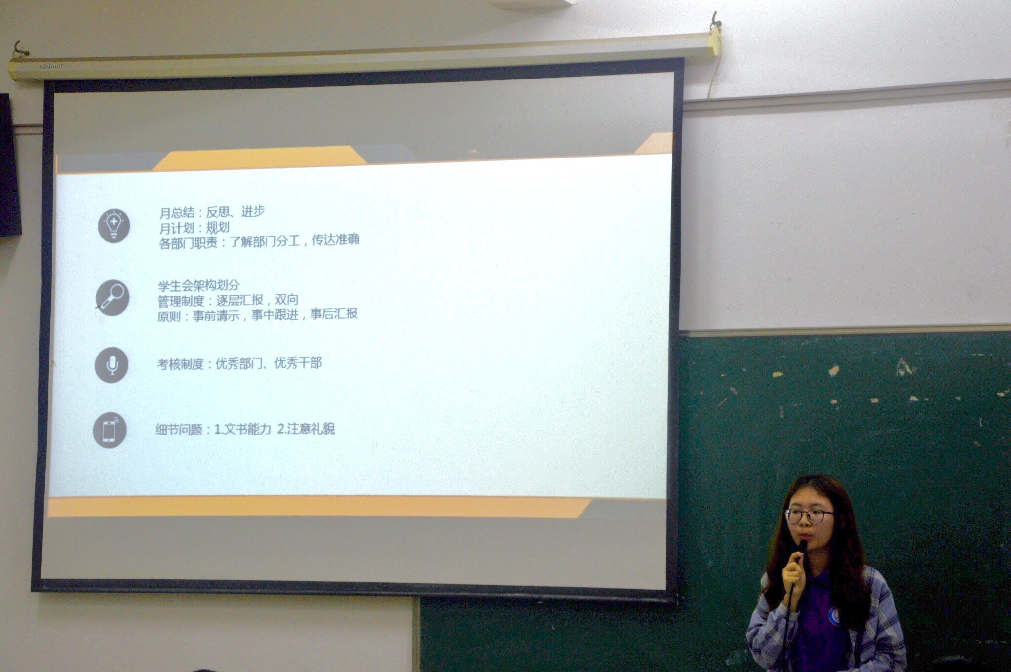 随后,学生会主席邝彩茵发言表示对待工作应认真负责,更好的为老师分忧为学生服务。接着,学生会秘书长钟文浩还提倡大家要学会自我反思自我总结,发现问题的同时也要寻求问题的解决办法,这样才能提升自身的工作能力。