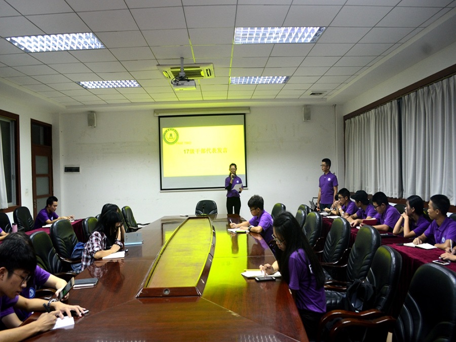 首先,会议在激昂的共青团团歌中拉开序幕。随后,由17级干部代表进行发言,发表对如何争当一名优秀干部的看法和做法,以及未来对自己学习工作的更高要求;接着由16级干部代表进行发言,倡导全体干部学习十九大精神,树立服务意识,努力向优秀干部看齐;接下来是现场讨论,在场干部积极的提出自己对于优秀干部的见解,并探讨如何成为一名工作学习两不误的优秀学习干部;最后,由金融学院团委组织部干部李叶祥总结会议,优秀学生干部应该树立服务意识,处理好学习与工作、学生与干部的关系,积极参与体育活动,强身健体,全面提升个人思想道德修养,从而成为一名优秀学生干部。