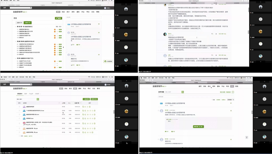 本次共四位老师进行网络课堂教学经验的分享。葛任老师针对在《金融营销学》课程教学中的硬件设备、网络自学平台、网络直播平台和课堂小结部分作了经验交流;曾榆桂老师针对在《报关与报检实务》课程教学当中的作业布置、录播上传以及课堂情况监控等做了经验交流;杨娜娜老师针对在《国际金融》课程教学当中的课堂互动、课后复习、课堂板书和课后作业等进行了交流,并指出网络课程要与翻转课堂和精品课程录制有机结合;郑卉殷老师针对在《金融营销学》课程教学中的案例应用和关注学生观点等方面作了经验交流。