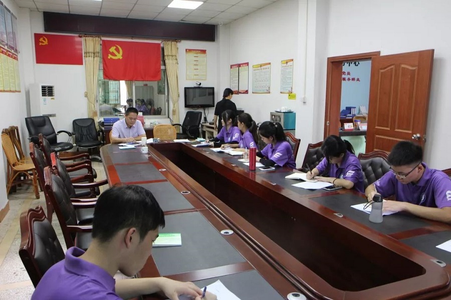 “青春逐梦服务队”调研组一行跟着带队老师林彦君来到了杨子坑村村委会,在村委会办公室里拜访了村委书记,老师跟村委工作人员报备了调研组的任务,书记对此跟我们介绍了村里的地理位置和基本的经济情况,并提出了要分年龄段、分难度调研的意见。