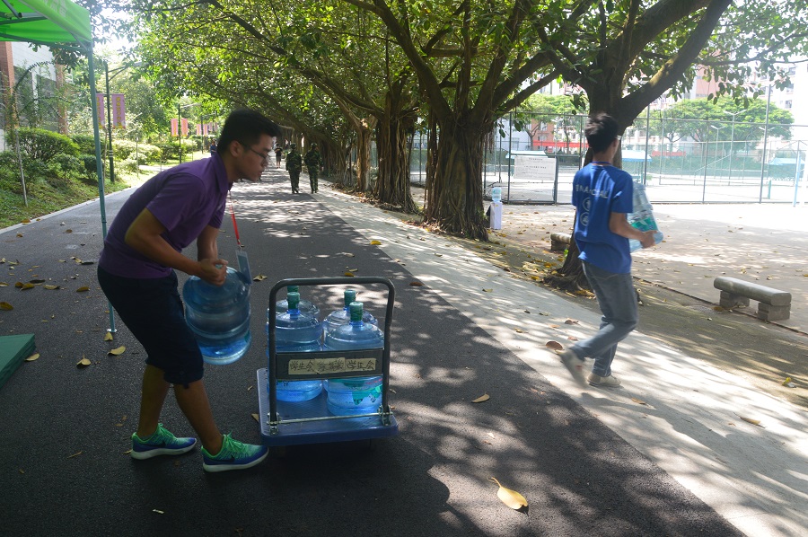为了让18级新生在军训期间享受到更好的照顾,让他们能够从新的环境中感受到家的温暖,团学干部轮流值班,以帮助学生、老师为己任,尽最大的可能给予帮助。在新生军训期间,每天都有值班的干部早早驻扎在大本营,确保新生和教官军训用水的供给,每天都会有专人把桶装水运到广商排球场;团学干部还会准备好葡萄糖和盐,及时地为新生提供基本的能量和盐分补给;除此之外,还会准备好医药箱,随时准备好为同学们服务,同时对于生病受伤的新生,团学干部还会现场给予照顾,让新生感受到金融学院对于他们的关爱。他们默默无闻,他们无私奉献,他们就是——紫衣人。
