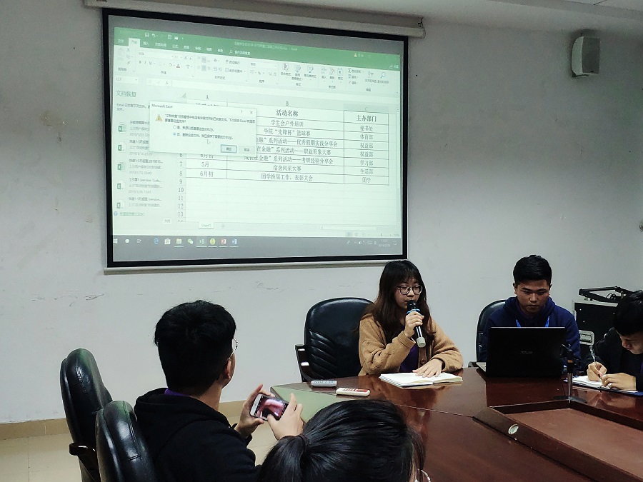 最后,主席团进行了金融学院学生会2018-2019学年第二学期的工作部署。学生会主席邝彩茵详细列出了本学期的主要工作以及具体工作安排,并且提出了“繁杂的事情简单做,简单的事情重复做,重要的事情用心做”的工作理念。