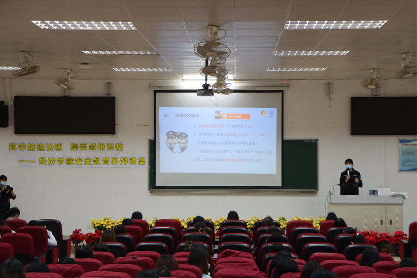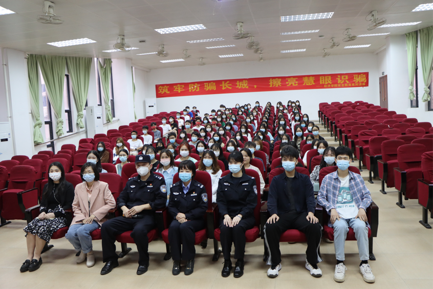为提高学生对诈骗手段的认识以及应对处理能力,增强自我保护意识,防止上当受骗。经济学院于3月2日下午在四教第二报告厅召开2020级防诈骗进校园安全知识教育讲座。出席本次活动的嘉宾有广州市公安局黄埔区分局公共关系科郑莉莉警官、龙湖派出所范志红警官、经济学院党总支书记张雪梅、学工部陈玉耿老师、保卫处朱国林老师、18级辅导员魏楚玲、19级辅导员陈丽红、20级辅导员曾彦瑜、21级辅导员黄泽妙。广州市公安局黄埔区分局公共关系科周婷作为宣讲员主持本次讲座。