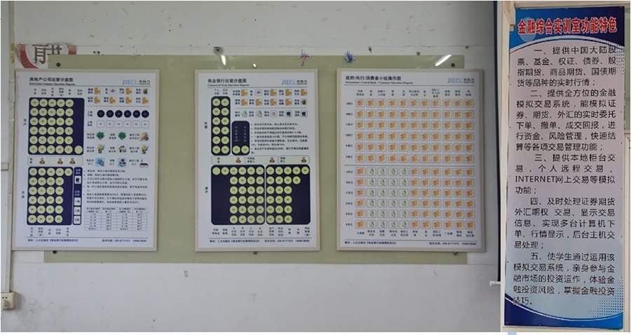 金融综合实训室位于第一教学楼310课室,占地120平方米,可同时供70名学生上课使用。该实验室最主要的功能在于提供全方位的金融模拟交易系统,能模拟各种交易管理功能,通过模拟的商务投资环境加强学生对金融知识的理解,训练学生的实际操盘能力,为金融、投资分析类专业及其它相关专业的学生走向社会提供一个理论结合实际的实习环境,使学生通过运用该模拟交易系统,亲身体验金融行业的运作,掌握金融投资技巧,从而达到积累金融投资经验、培养优秀金融投资人才的目的。