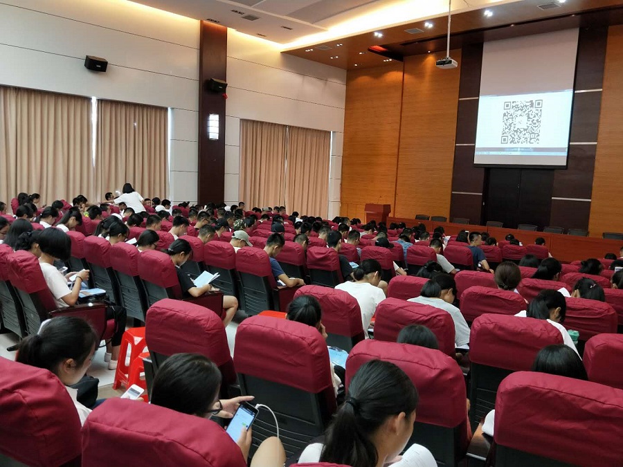金融学院共分2场,全体新生都热情饱满的参与此次活动,在进入报告厅之前,图书馆志愿者将广州商学院图书馆读者手册以及图书馆新生教育试卷分发给大家。进入会议厅新生整齐入座后,伴随着图书馆工作人员的讲解,会议由一段广州商学院图书馆的摄影记录视频拉开帷幕,视频中便详细地为我们介绍了图书馆各个方面的内容。最后,再对学生的进行一次小型的考试,目的是考察新生看完视频后对广州商学院图书馆的了解程度。